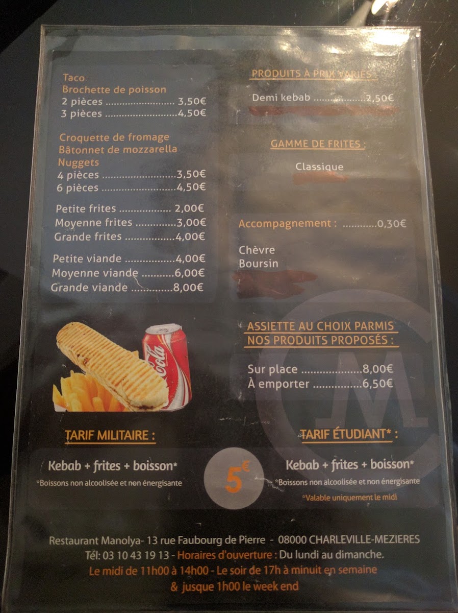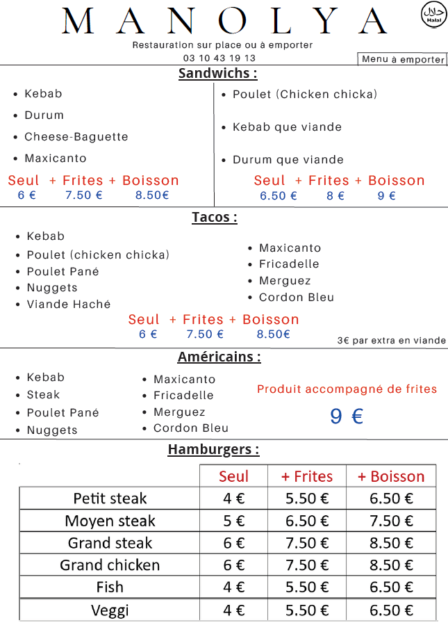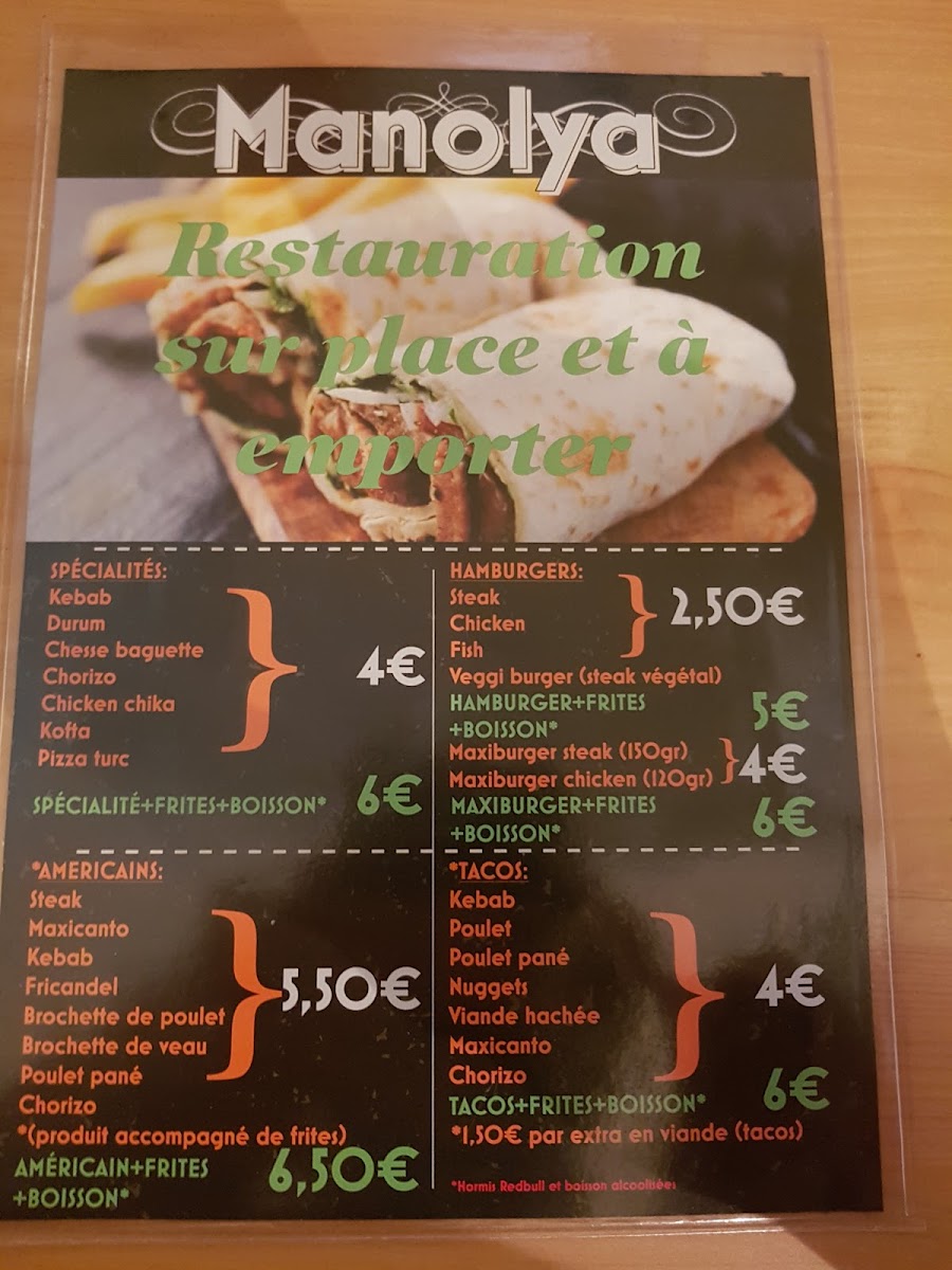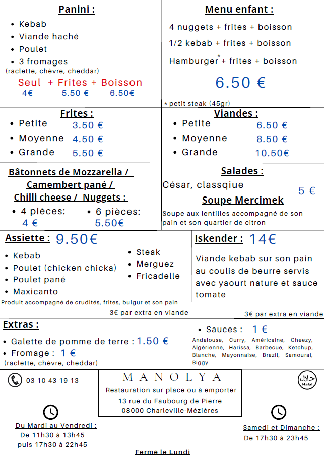 Introducing the menu at Manolya, a charming fast food destination nestled in the heart of Charleville-Mézières. This culinary gem is renowned for its generous portions and exceptional flavor profiles. According to diners, such as Miurha, the welcoming staff and hearty meals create an inviting atmosphere that is perfect for families and friends alike.